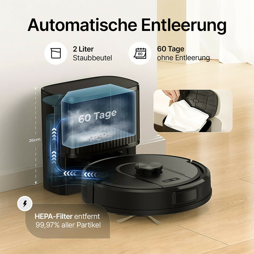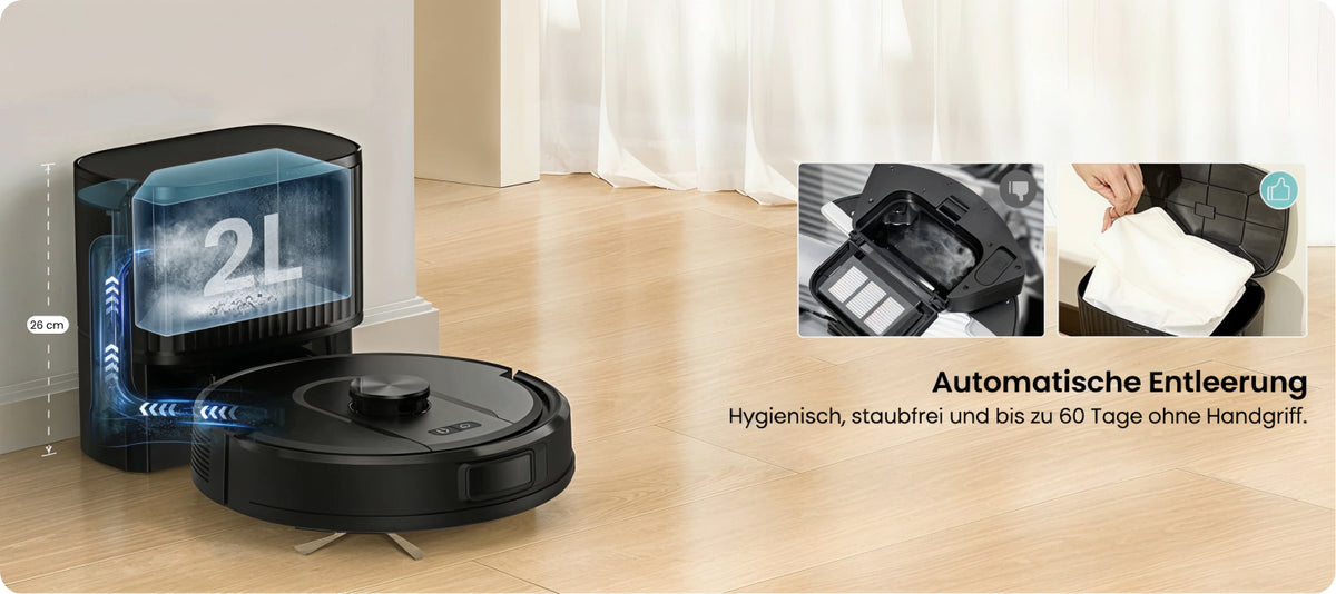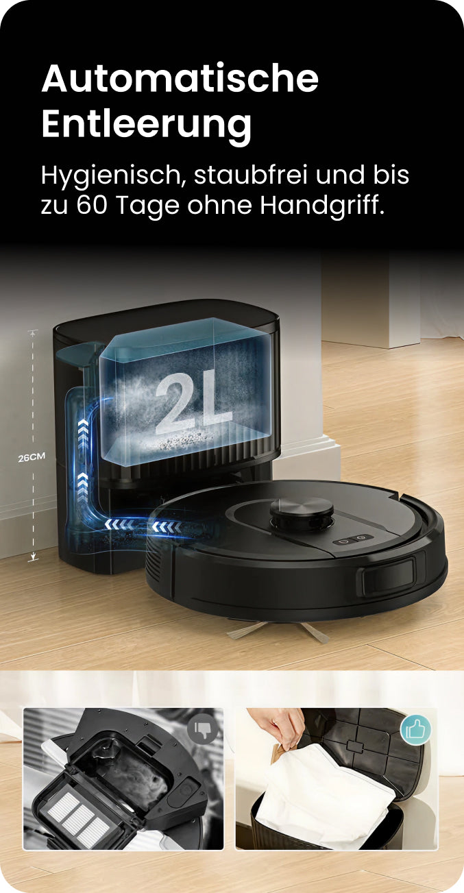 - ✓ Automatische Entleerung. Nach jedem Reinigungslauf entleert die Station den Staubbehälter hygienisch und staubfrei. Der großzügige 2 Litern Fassungsvermögen reicht für bis zu 60 Tage. So genießt du ein sauberes Zuhause ohne Aufwand.