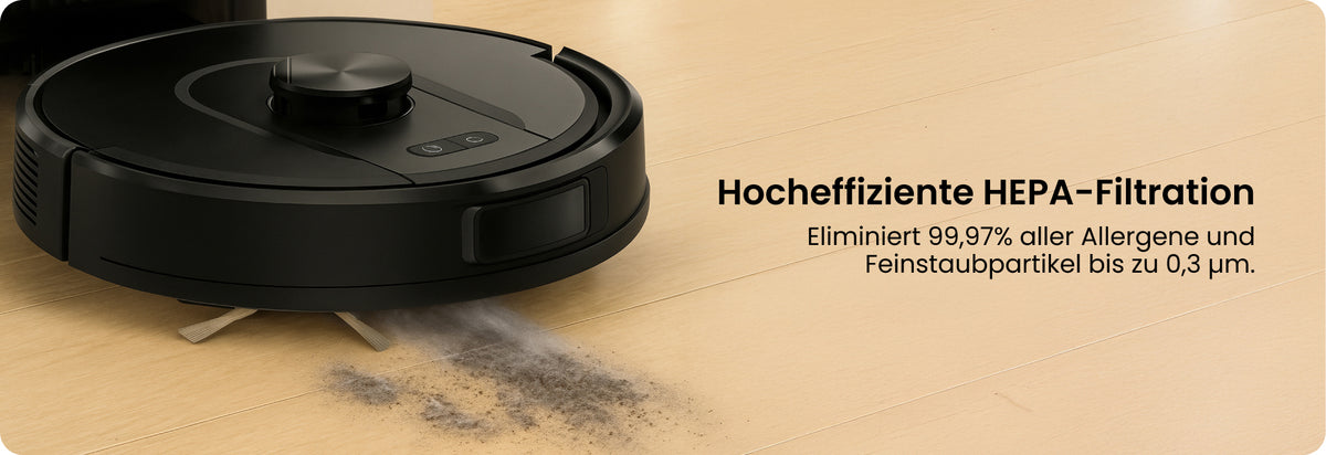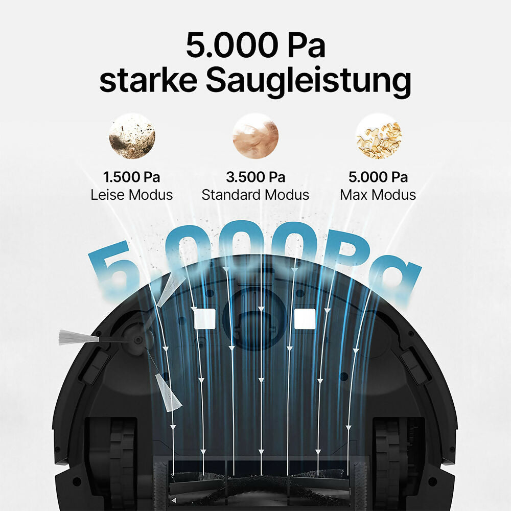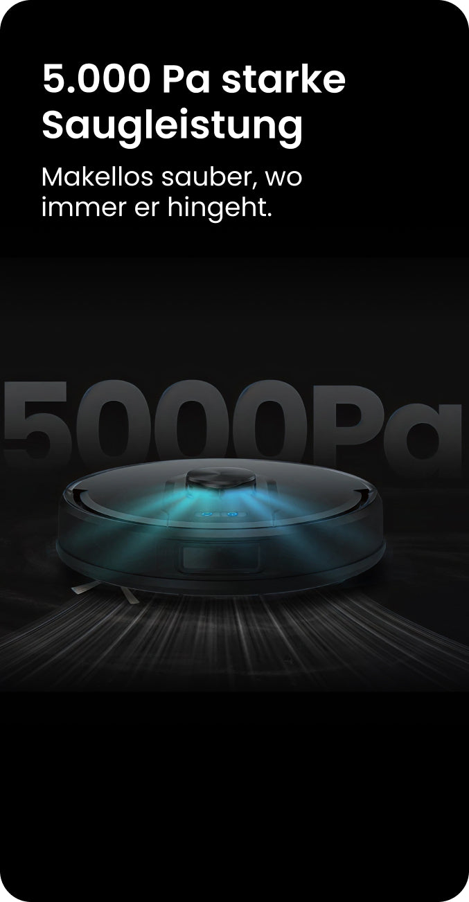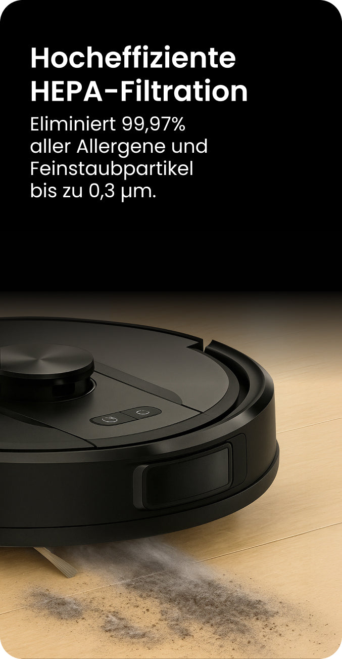- ✓ 5.000 Pa starke Saugleistung. In Kombination mit modernster HEPA-Filtertechnologie entfernt der W11 bis zu 99,97% aller Partikel – von Tierhaaren bis zu feinsten Staubpartikeln. Im Gegensatz zu herkömmlichen Saugrobotern bleibt die Leistung konstant hoch, selbst wenn der Behälter sich füllt.
