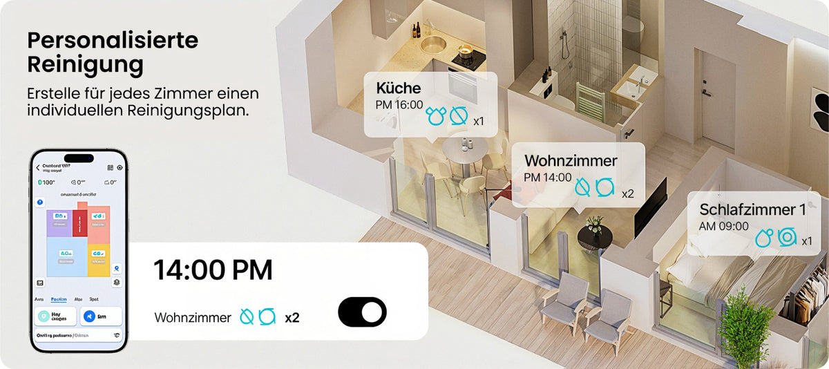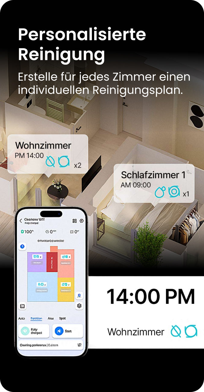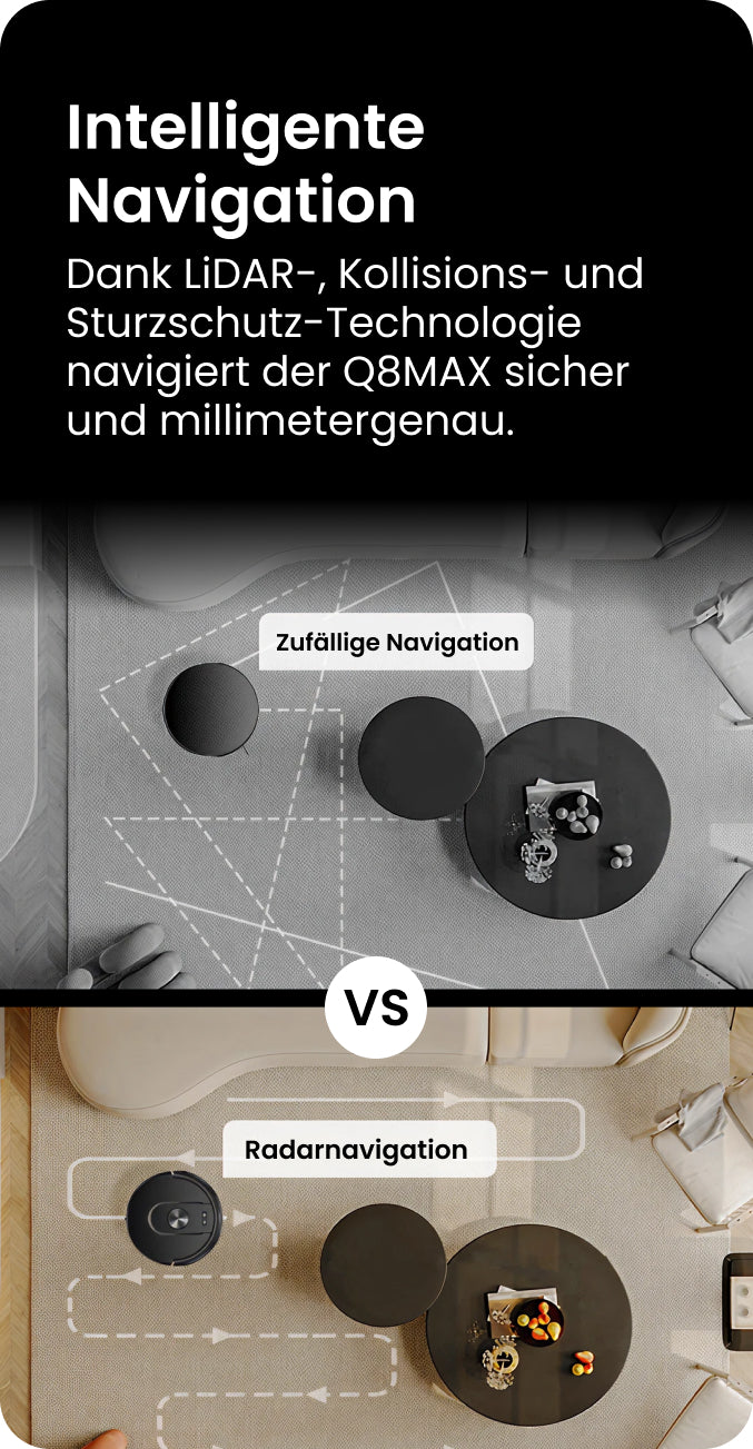 - ✓ Intelligente Navigation. Dank modernster LiDAR-Technologie, Kollisionsschutz und Sturzsensoren navigiert der W11 präzise durch dein Zuhause. Er umfährt Möbel sanft, erkennt Treppen und Kanten zuverlässig. So wird jeder Reinigungslauf effizient und präzise.