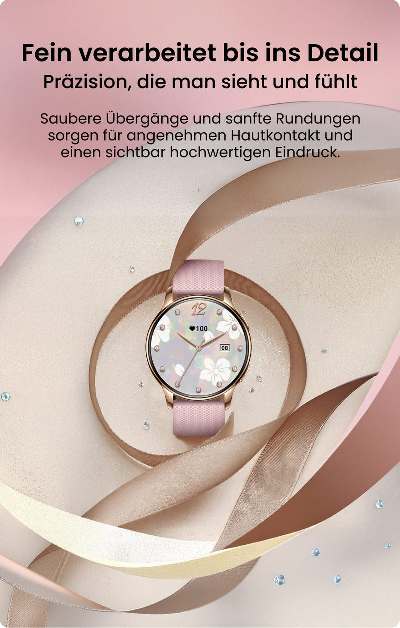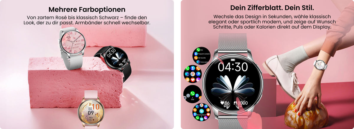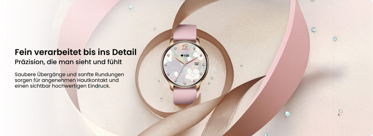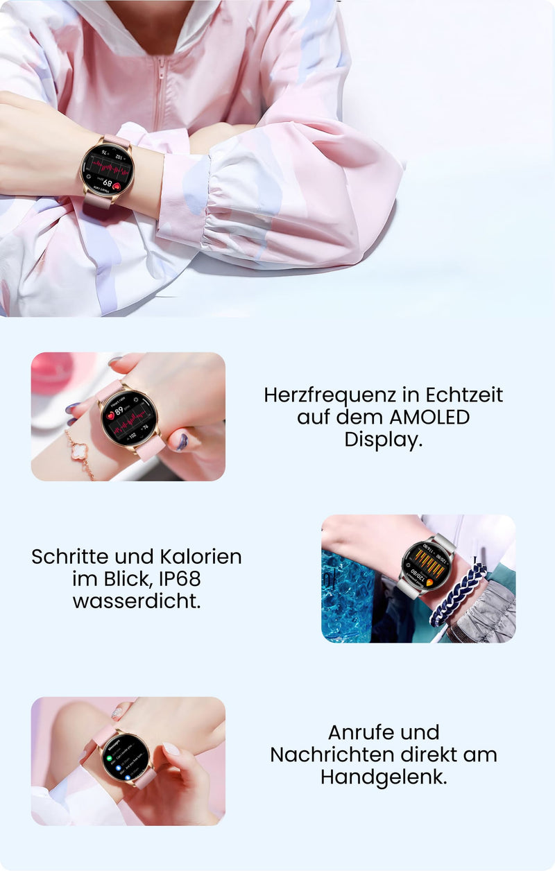 Funktionen | Herzfrequenz, Blutdruck*, SpO₂, Schlaftracking, Schritt/Kalorien, Stoppuhr, Wecker, Musiksteuerung, Kameratrigger, Find-my-Phone |