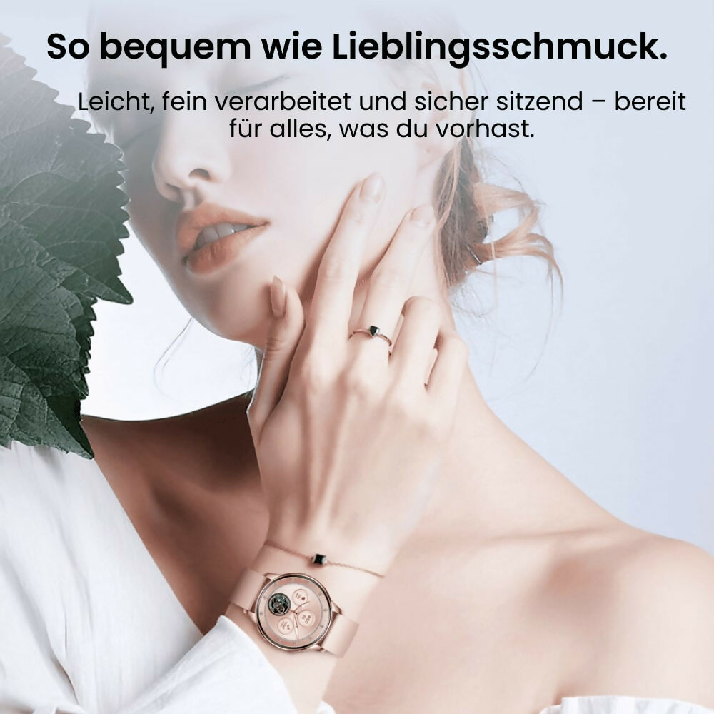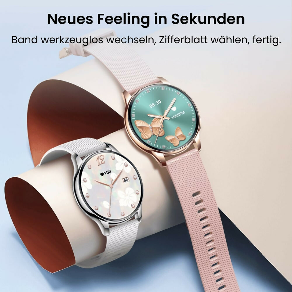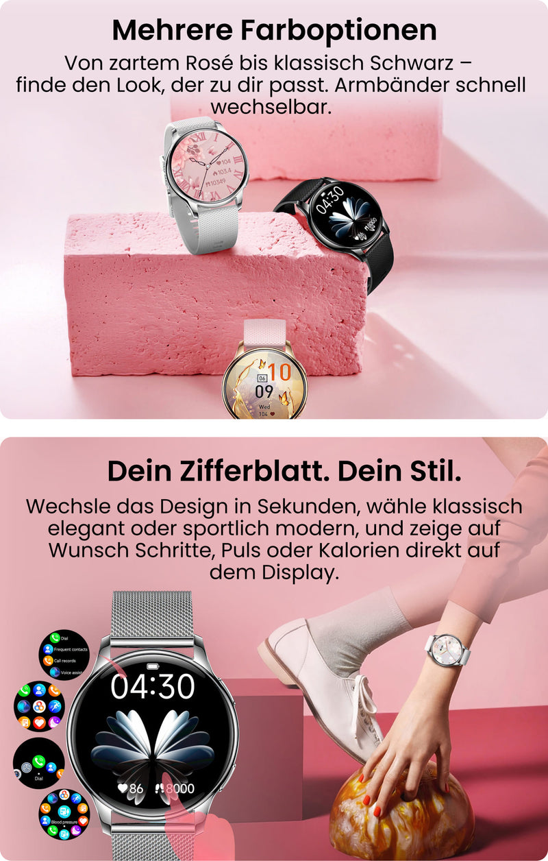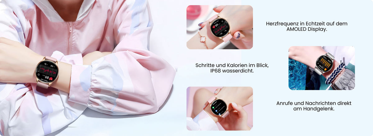 Funktionen | Herzfrequenz, Blutdruck*, SpO₂, Schlaftracking, Schritt/Kalorien, Stoppuhr, Wecker, Musiksteuerung, Kameratrigger, Find-my-Phone |