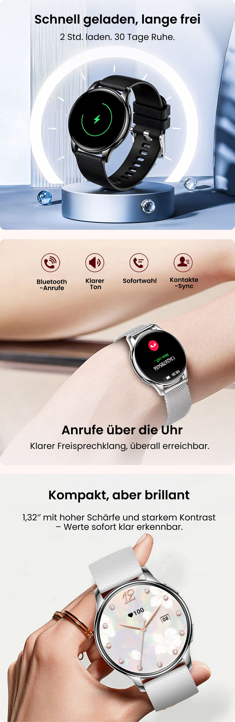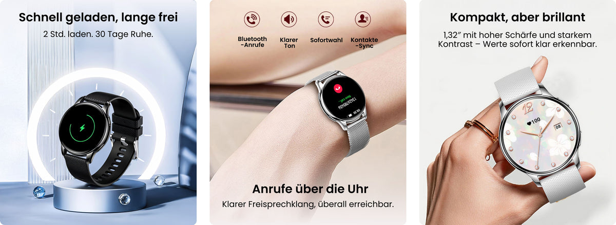 Akku | Schnellladen ca. 2 h; Standby bis zu 30 Tage (Nutzungsdauer abhängig von Display-Helligkeit, Always-On, Sport/Anrufen, Benachrichtigungen) |