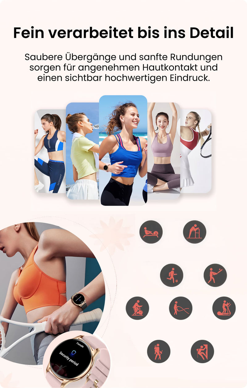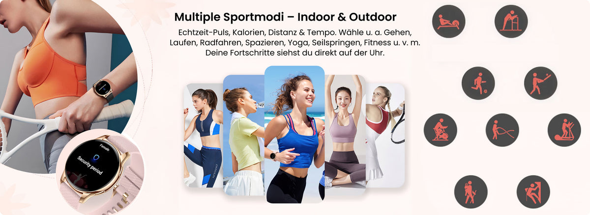 Sportmodi | Indoor & Outdoor, inkl. Laufen, Gehen, Radfahren, Yoga, Fitness u. a. |