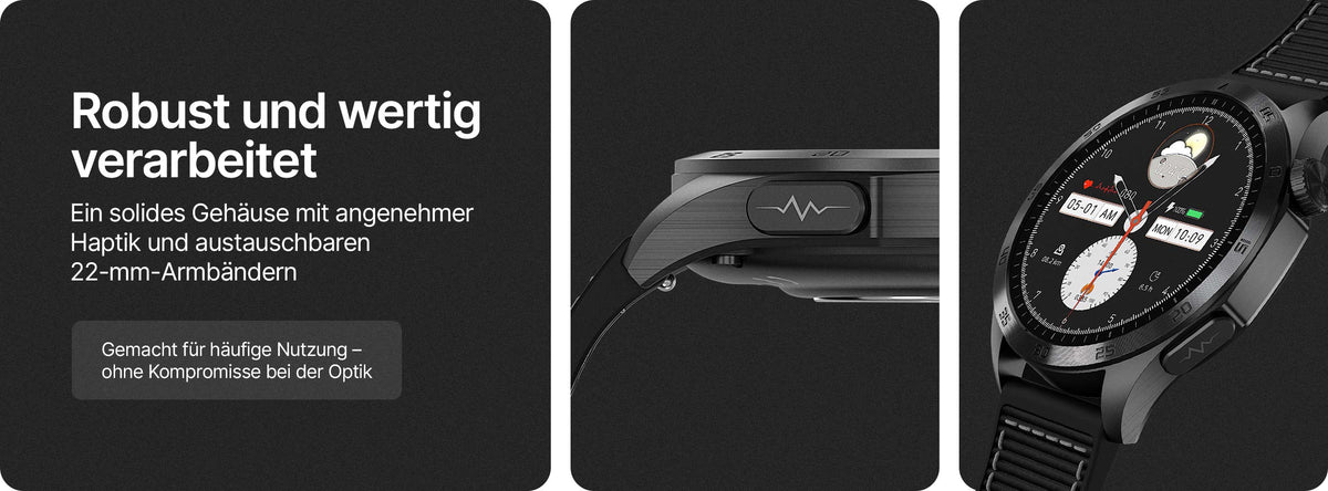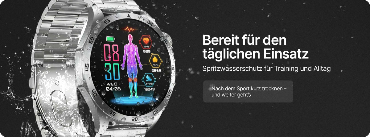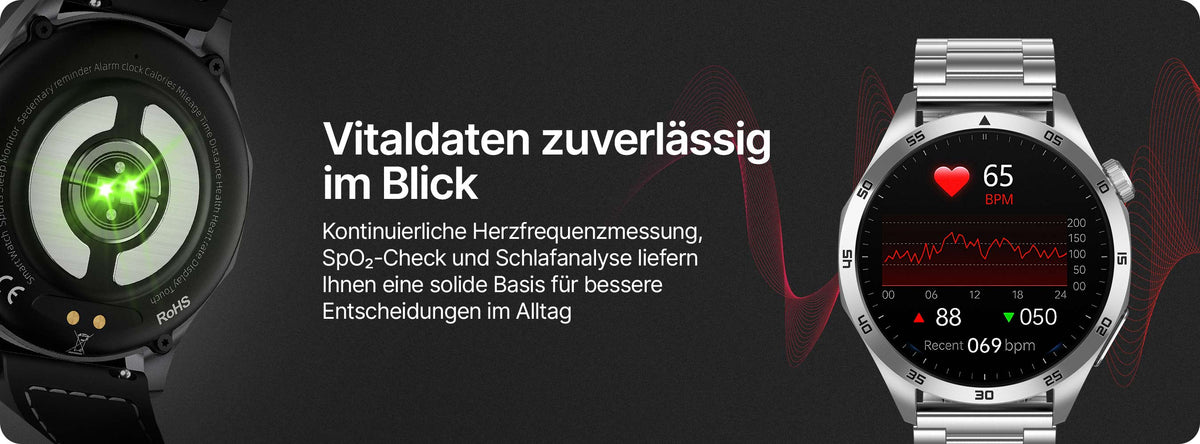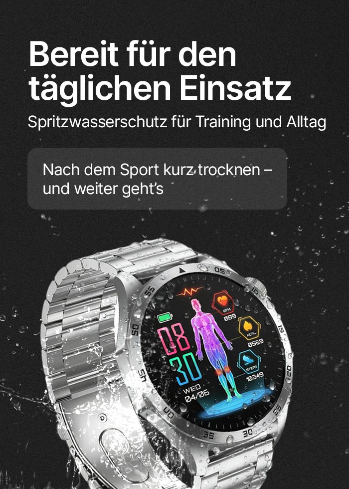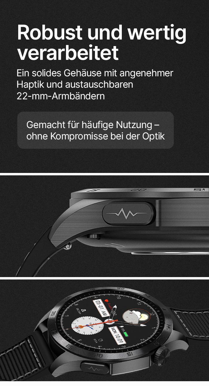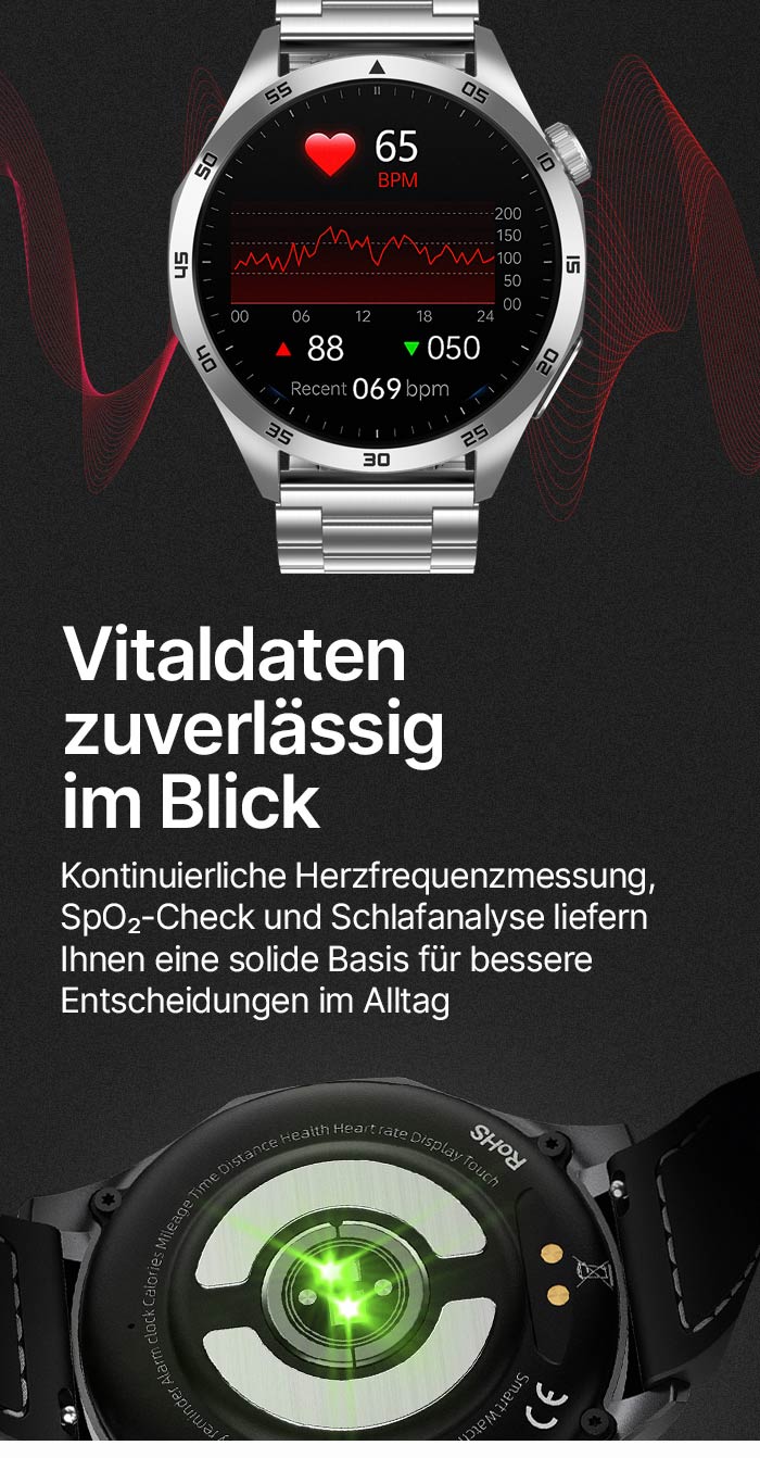 - ✓ Gesundheit im Blick: Herzfrequenz, Blutdruck*, SpO₂ (Infrarot+Rotlicht „True SpO₂“) sowie ECG/HRV, Stress- & Ermüdungserkennung.