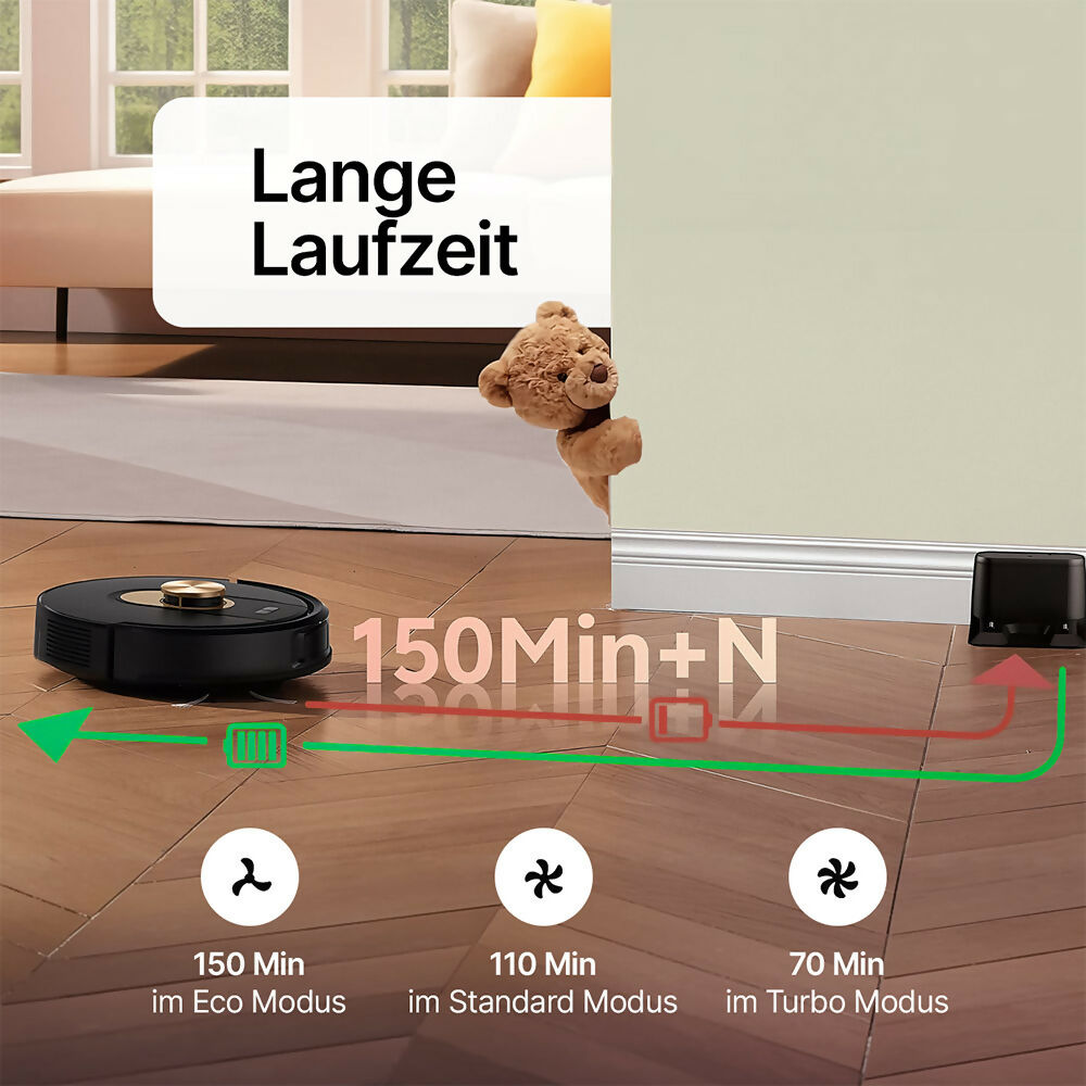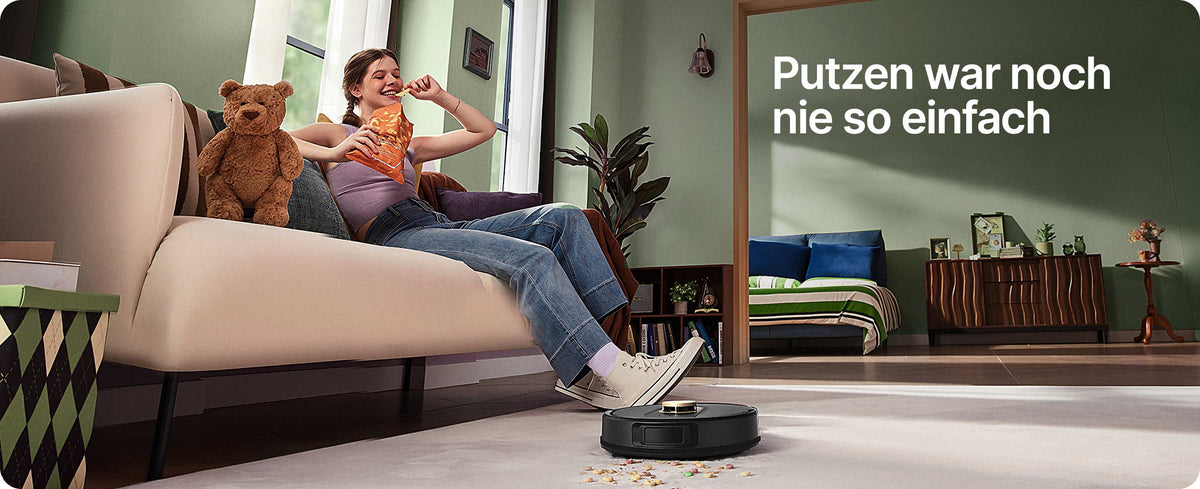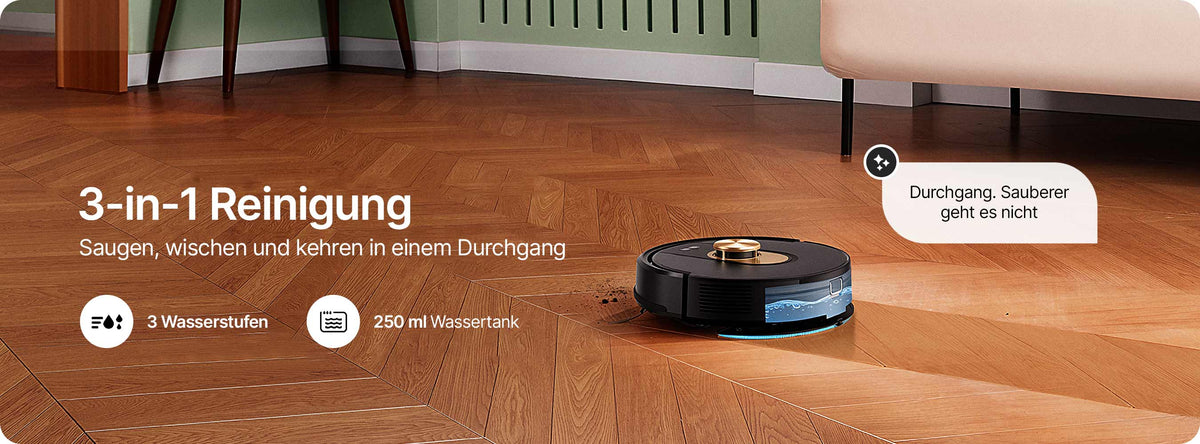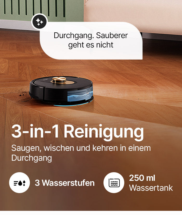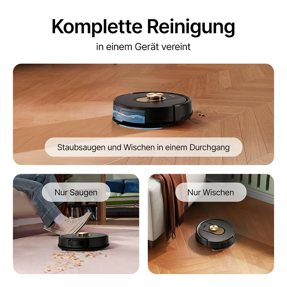 - ✓ Personalisierte Reinigung. In der App wählst du Räume gezielt aus, passt die Saugleistung individuell an und legst bis zu 15 Sperrzonen fest. Die Reinigung richtet sich nach deinem Alltag – nicht umgekehrt.