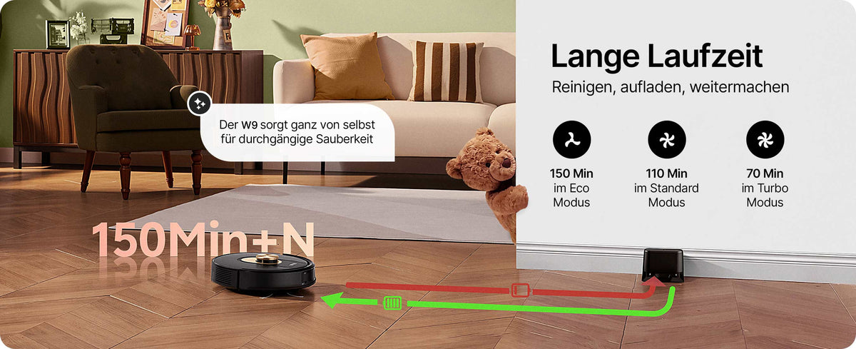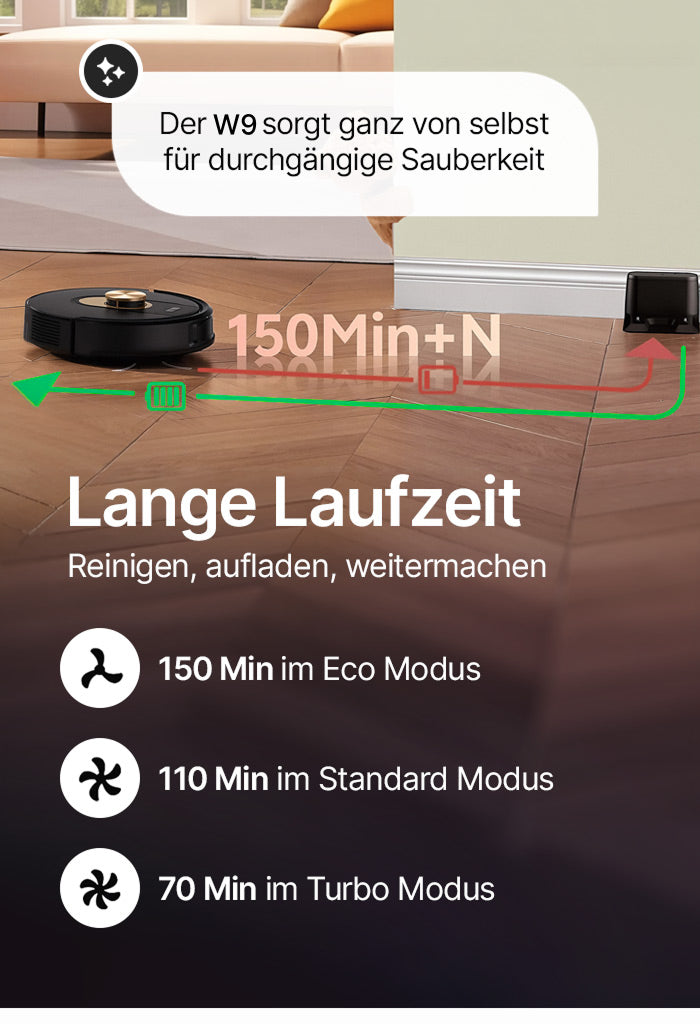 - ✓ Lange Laufzeit. Mit bis zu 150 Minuten Akkulaufzeit reinigt der W9 selbst große Wohnungen in einem Durchgang. Geht die Energie zur Neige, lädt er sich automatisch auf und macht genau dort weiter, wo er aufgehört hat.