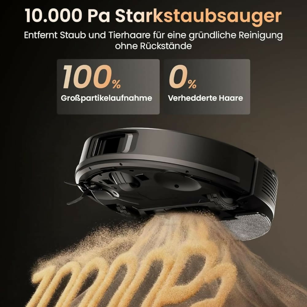 - ✓ Extrem starke & leise Reinigung: Mit einer Saugkraft von bis zu 10.000 Pa entfernt der Saugroboter mühelos Staub, Krümel, Tierhaare und tiefsitzenden Schmutz von Hartböden und Teppichen. Die automatische Teppicherkennung erhöht die Leistung gezielt, während der leise Betrieb mit nur 60 dB angenehm unauffällig bleibt.